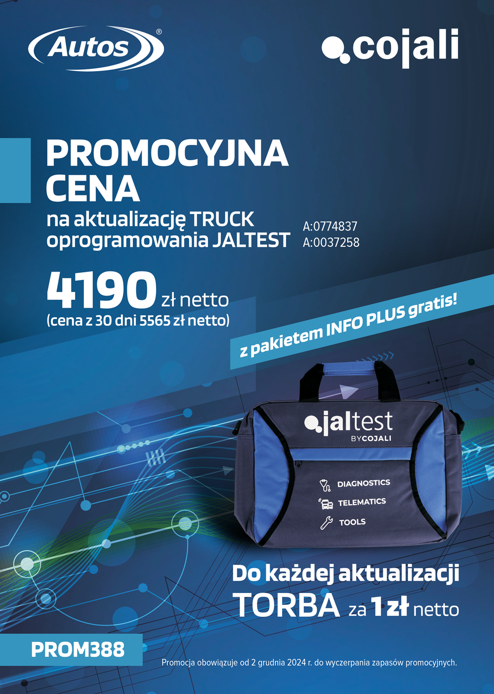 Promocyjna cena na aktualizację TRUCK oprogramowania JALTEST – 4190 zł netto (cena z 30 dni 5565 netto). Do każdej aktualizacji TORBA za 1 zł netto i pakiet INFO PLUS gratis!